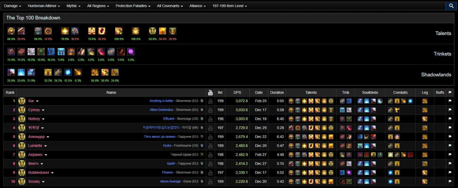 Currently I am the worldwide Number One Alliance Prot Paladin at my item level bracket for Mythic Huntsman Altimor, across all regions and all Covenants!
