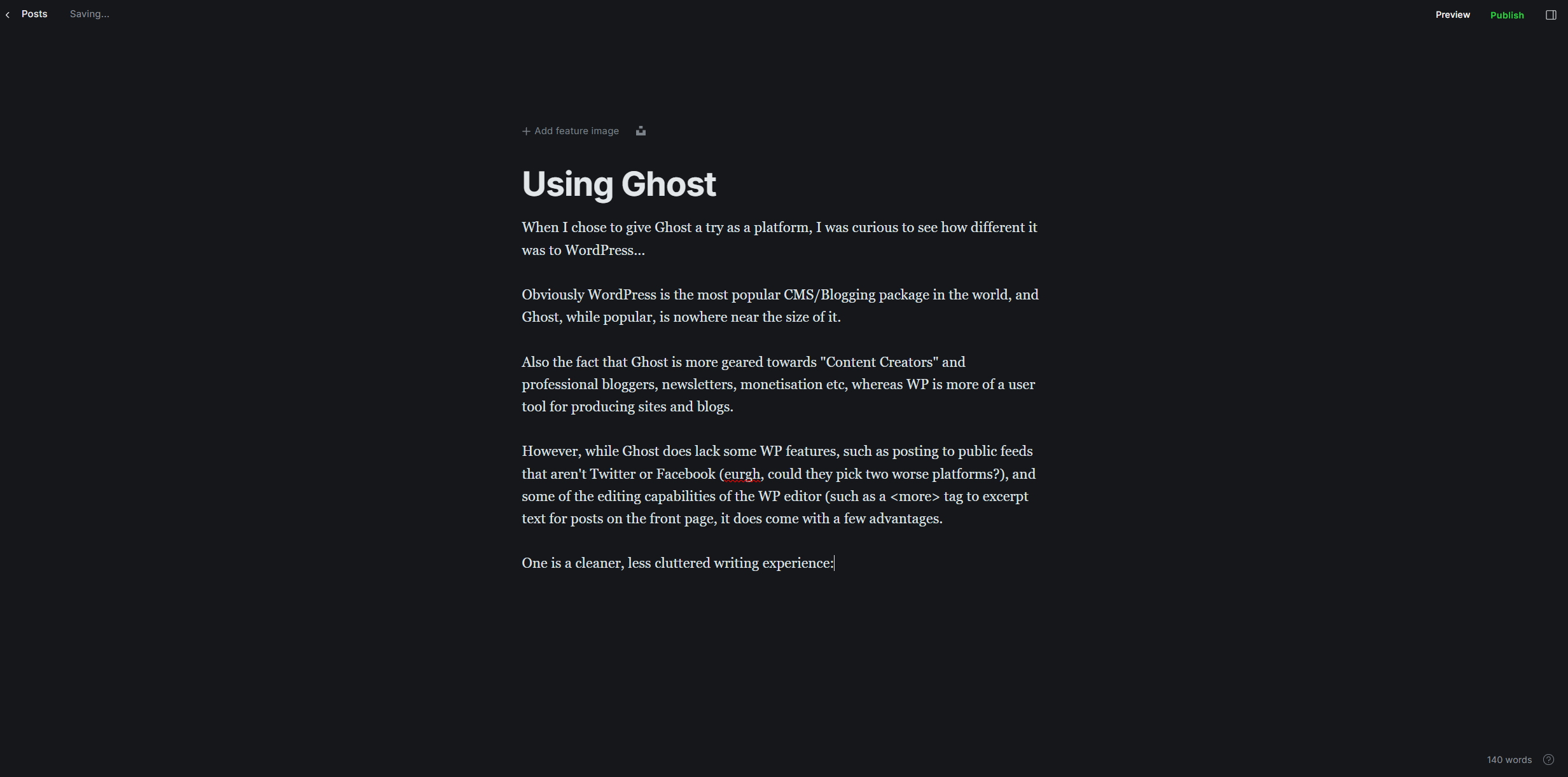 While Ghost does lack some WP features, such as posting to public feeds that aren't Twitter or Facebook (eurgh, could they pick two worse platforms?), and some of the editing capabilities of the WP editor (such as a <more> tag to excerpt text for posts on the front page (although it can use an alternative method as you can see), it does come with a few advantages.